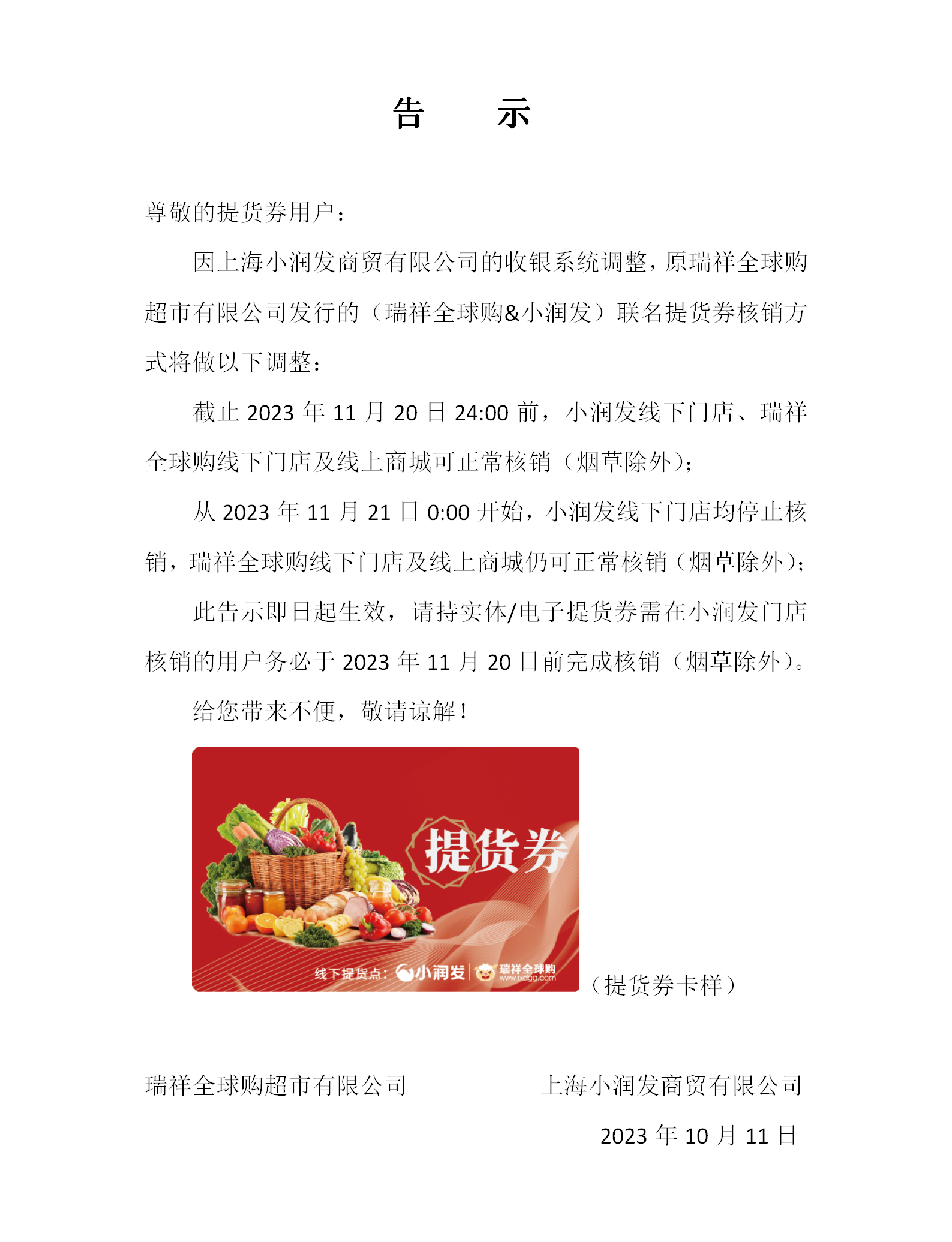 關(guān)于小潤(rùn)發(fā)提貨券合作調(diào)整公告