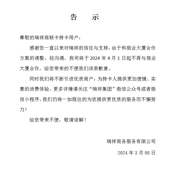 關(guān)于張家港商業(yè)大廈暫停合作公告